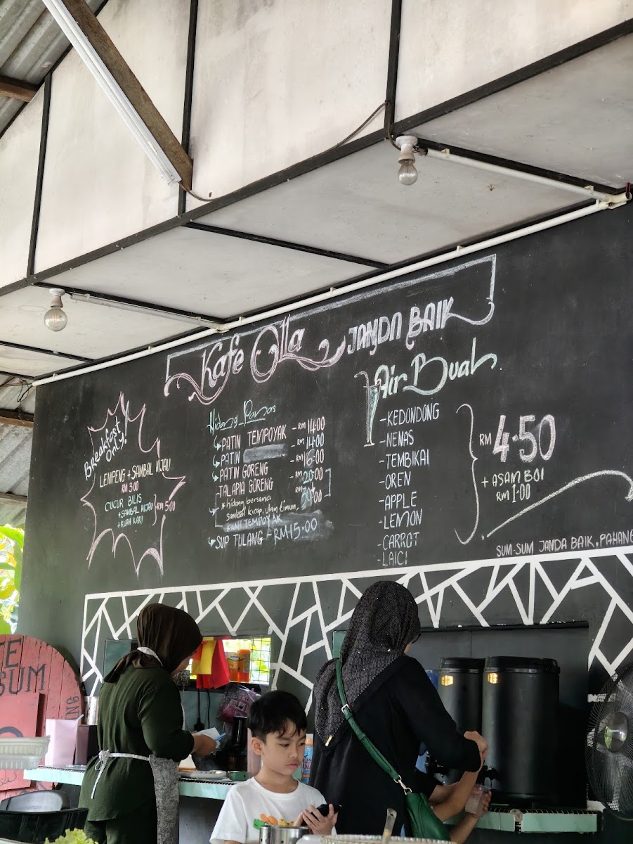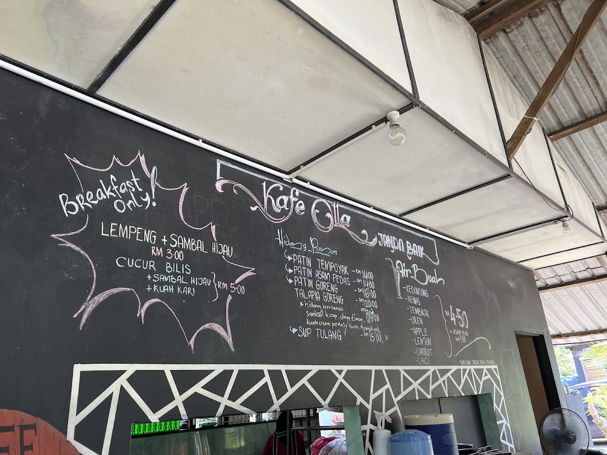 The menu at Kafe Olla features a variety of traditional Malaysian dishes with a focus on freshly prepared fish options. Visitors can expect a selection of fried fish such as patin and tilapia, served alongside rice and a range of side dishes including sambal kicap and vegetables. The offerings also include local specialties like gulai rebung, daging masak lemak, ayam, and other lauk (side dishes) typical of a kampung-style cafe.