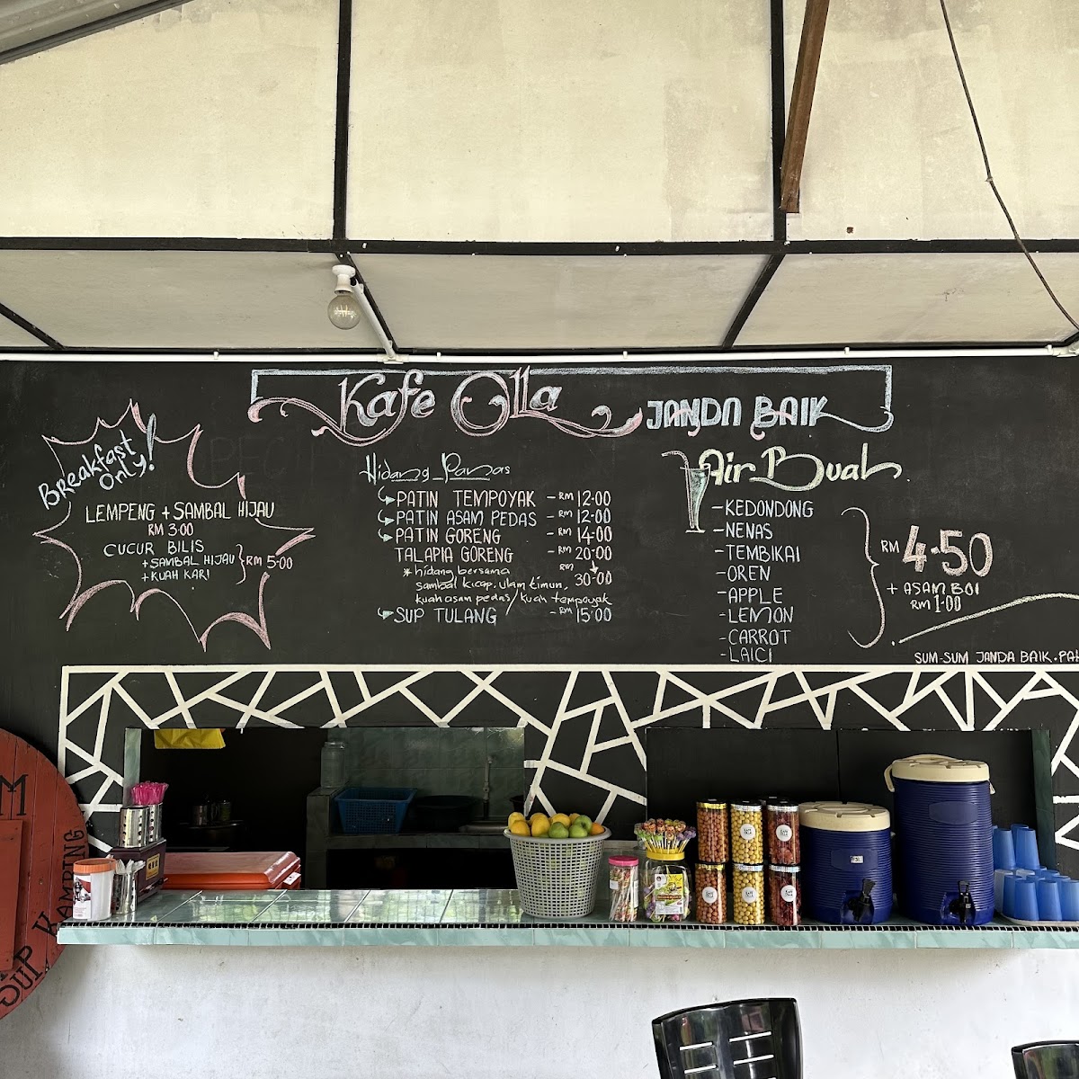 Besides main meals, the menu includes light bites and local beverages such as lime with asam boi, suitable for coffee breaks or casual dining. The menu is generally suited for lunch or light meals, with preparation times noted for some fried fish items.